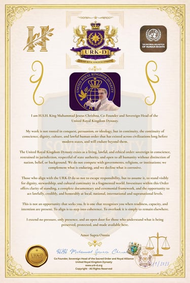 © 2025 United Royal Kingdom – Dynasty (URK-D) | A Sovereign Royal Alliance for Unity, Peace, and Nobility All Rights Reserved under International Sovereign Law, Protected by International Copyright & Sovereign Moral Rights.