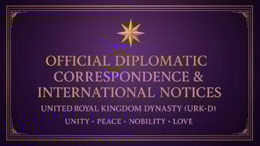 The United Royal Kingdom Dynasty (URK-D) hereby presents a public archive of formal diplomatic correspondence issued to governments, international institutions, and councils of global significance. These communications serve as official notices of our presence, purpose, and intent to engage in peaceful cooperation and constructive dialogue.