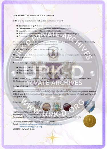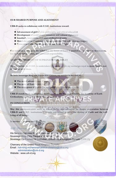 This correspondence was issued to the Supreme Council of Humanity, the World Philosophical Forum, and affiliated bodies under the Universal State of Earth (USE). The communication introduces the United Royal Kingdom Dynasty (URK-D) as a sovereign alliance dedicated to shared global values including moral development, peace, enlightened citizenship, and the betterment of humanity.