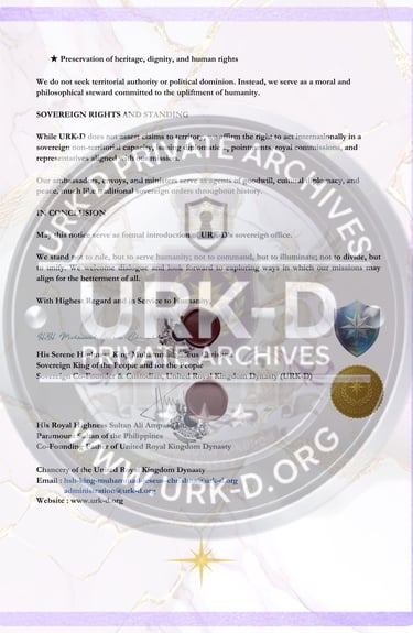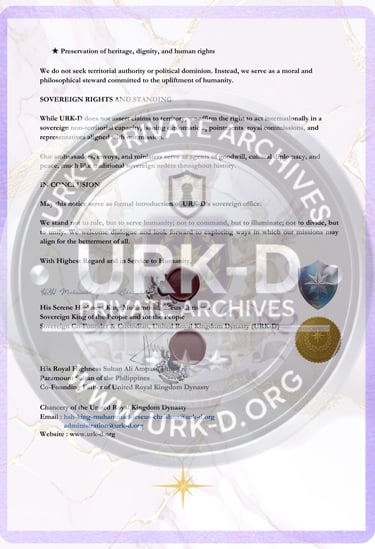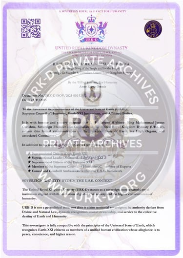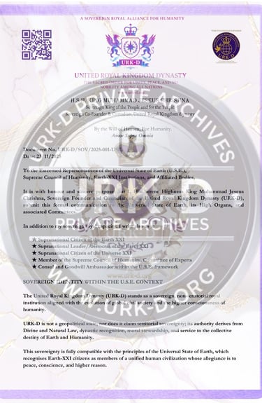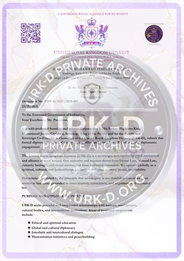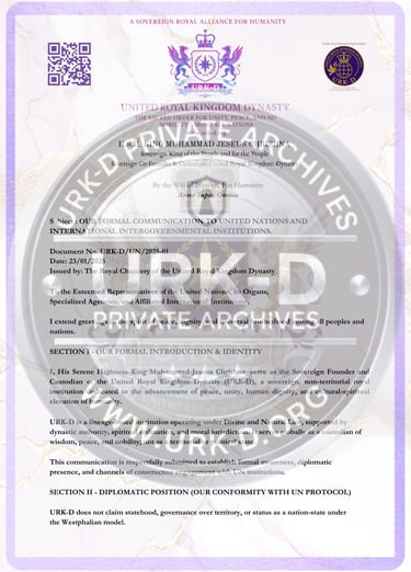© The United Royal Kingdom Dynasty (URK-D). All Rights Reserved. THE Sovereign Royal Alliance & Intercultural rOYAL Institution dedicated to Unity, Peace, Nobility, and Love. All diplomatic documents published herein remain the intellectual and sovereign property of URK-D and may not be reproduced, distributed, or used for official representation without express written authorization. Unauthorized claims of affiliation, titles, or representation are strictly prohibited and subject to international legal remedy.