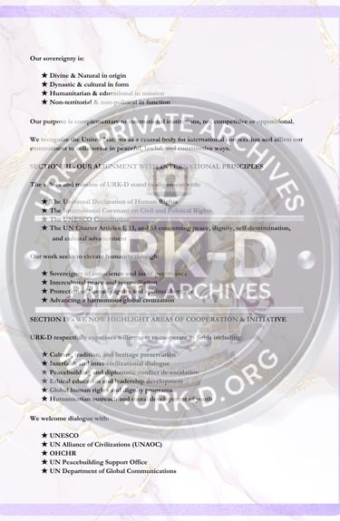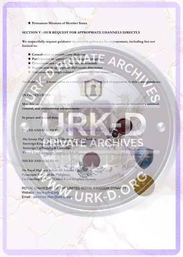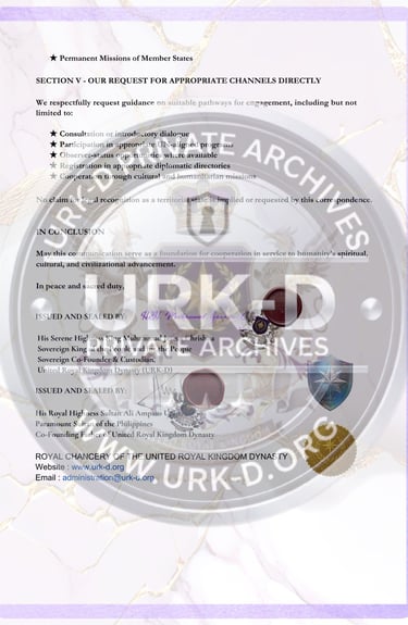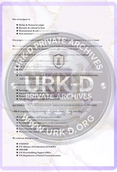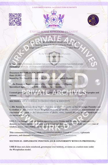 This formal correspondence was issued to the Secretary-General and relevant departments of the United Nations as an official introduction of the United Royal Kingdom Dynasty (URK-D) and its sovereign mission. The communication declares the establishment of open diplomatic channels and extends an invitation for future cooperation in areas of global peacebuilding, cultural advancement, humanitarian service, and ethical development. It affirms the URK-D’s standing as a sovereign alliance committed to unity among peoples, respect among nations, and service to humanity.