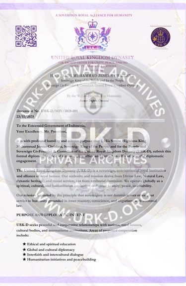 This correspondence was formally delivered to the Office of the President of Indonesia and key governmental bodies as an introduction of the United Royal Kingdom Dynasty (URK-D), its objectives, and its sovereign standing. The letter expresses respect for the Republic of Indonesia, outlines the purpose of our presence within the nation, and initiates official diplomatic engagement rooted in harmony, respect, and lawful cooperation.