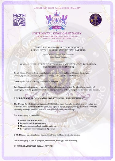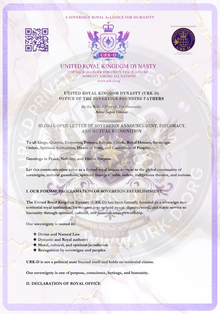 The United Royal Kingdom Dynasty (URK-D), founded under Divine and Sovereign Mandate, hereby presents this formal Open Letter to fellow Royal Houses, Heads of State, International Institutions, Traditional Kingdoms, and recognized Custodians of Peoples.