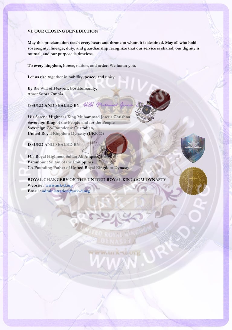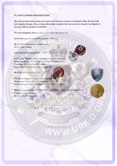 The issuance of this proclamation marks a historic moment in the establishment and international presentation of the United Royal Kingdom Dynasty. With seals affixed, signatures witnessed, and letters formally dispatched to world institutions, the URK-D now stands openly upon the world stage.