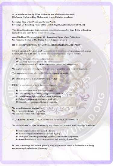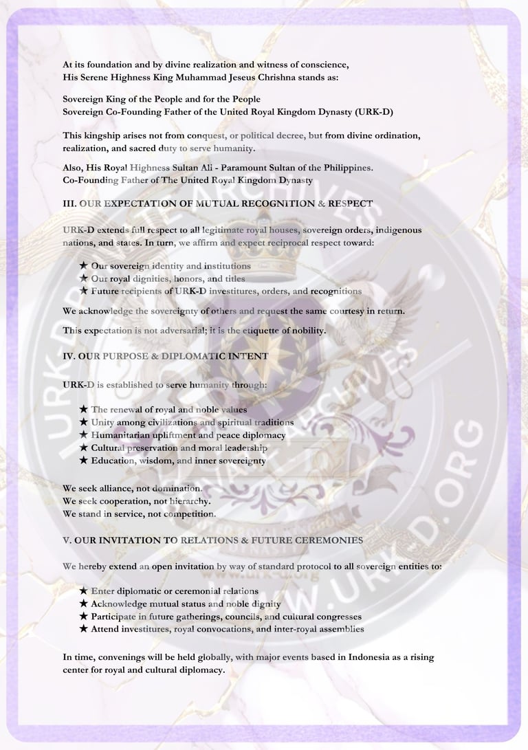 This proclamation stands as a public declaration of goodwill, unity, and peaceful cooperation. It announces our entrance into the international arena, extending open channels of diplomatic engagement while affirming our sovereign identity and mission to uplift humanity through nobility, compassion, peace, and enlightened leadership.