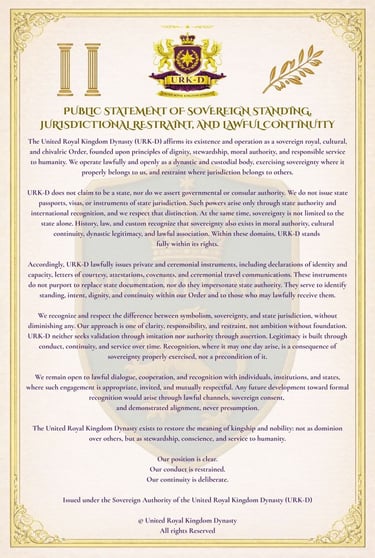 © 2025 United Royal Kingdom – Dynasty (URK-D) | A Sovereign Royal Alliance for Unity, Peace, and Nobility All Rights Reserved under International Sovereign Law, Protected by International Copyright & Sovereign Moral Rights.